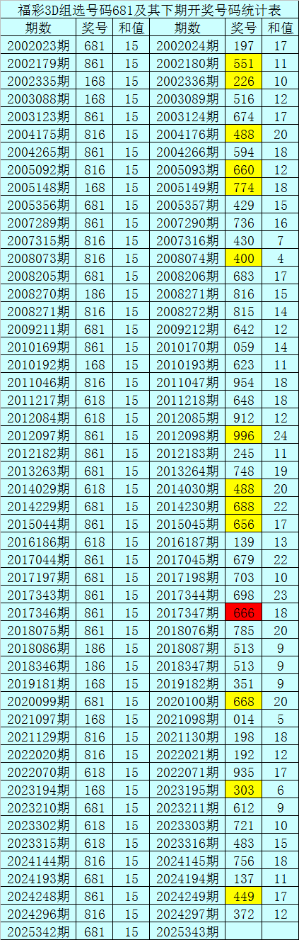 二、组选分析:历史上组选号码681开出了51次,其下期奖号差别为:197-551-226-516-674-488-594-660-774-429-736-430-400-683-816-815-642-059-623-954-648-912-996-245-748-488-688-656-139-679-703-698-666-785-513-513-351-668-014-198-192-935-303-612-721-483-756-137-449-372,其开出期数和下期奖号统计为: